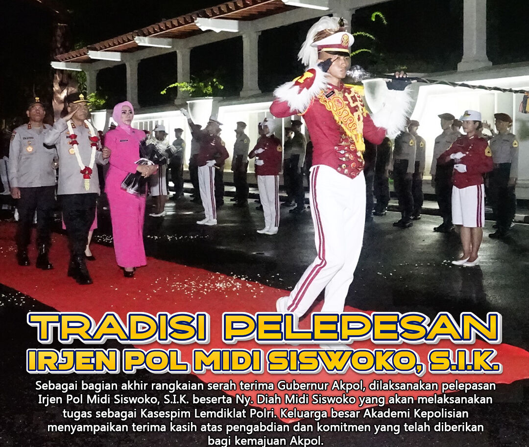 Seluruh keluarga besar Akademi Kepolisian turut mendoakan agar Irjen Pol Midi Siswoko dan Ny. Diah Midi Siswoko senantiasa diberikan kelancaran dan kesuksesan dalam mengemban amanah di tempat tugas yang baru. Semangat pengabdian yang telah ditanamkan di Akademi Kepolisian diharapkan terus menjadi inspirasi bagi seluruh Taruna dan civitas Akademi Kepolisian.